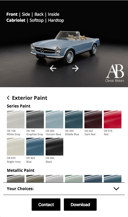 Bei diesem Projekt haben besonders Design und Technik Hand in Hand gearbeitet. Exterieur und Interieur lassen sich in vier Ansichten bearbeiten. Den Kunden stehen hierfür über 40 verschiedene Lackfarben, 16 Lederbezüge sowie Felgen und vieles mehr zur Verfügung.
